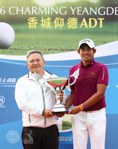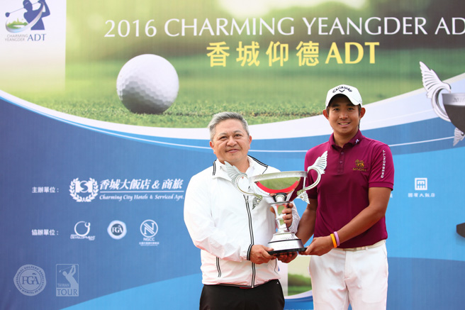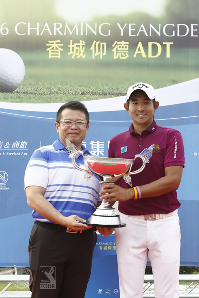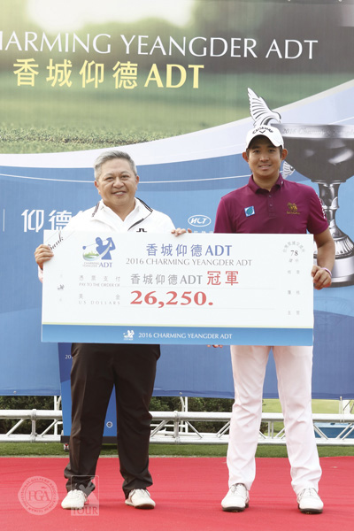 香城仰德ADT泰國帕維延長賽奪冠,香城飯店集團董事長邱忠賢(左)頒發冠軍支票與獎杯