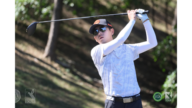 連續兩周拿下台巡賽及挑戰賽各一冠的蔡凱任,今天除了長桿不太穩定以外,推桿不錯28推,鐵桿勉強,10個成功上果嶺,小鳥柏忌各四個,也多是靠切推抓鳥;屬於大炮型的他,四個五桿洞小鳥柏忌各2,兩個洞吞柏忌就是開球歪掉,兩隻小鳥就是一切一推抓下。