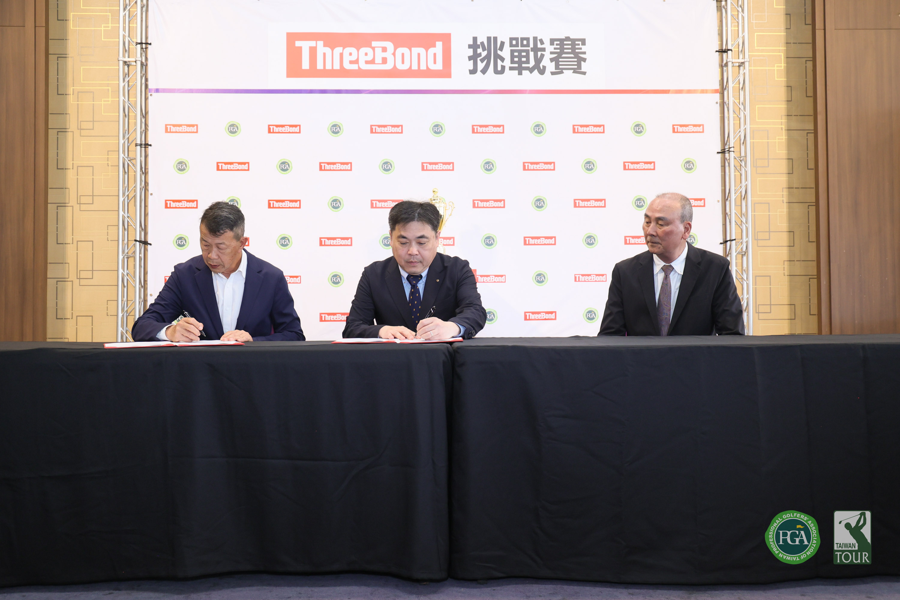 今天頒獎典禮結束後,ThreeBond公司與TPGA在斑芝花球場舉行簽約儀式,繼續第12年的總冠名贊助ThreeBond TPGA挑戰巡迴賽;在ThreeBond TPGA挑戰巡迴賽執行長陳志忠的見證下,由ThreeBond香港有限公司社長宮本成彥(Shigehiko Miyamoto) 和TPGA理事長陳榮興代表雙方進行簽約;ThreeBnd 香港有限公司台灣分公司支店長長島晃(Akira Nagashima)丶斑芝花高爾夫俱樂部總經理鄭博元均出席簽約儀式。
