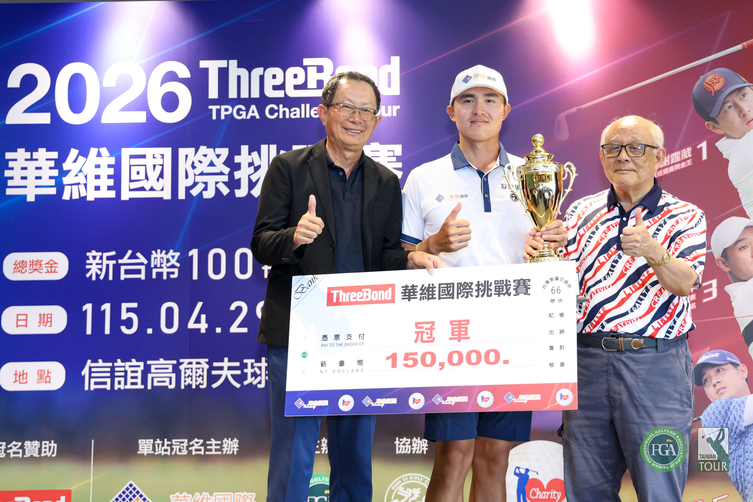 2026 ThreeBond挑戰巡迴賽第三站華維國際挑戰賽今天(30日)在高雄信誼高爾夫球場進行最終回合,華維國際贊助的地主選手蘇晉弘,發揮水準,打出五鳥一柏忌的低於標準桿4桿的68桿,以兩回合總桿低於標準桿9桿的135桿,三桿勝差,贏得冠軍及獎金15 萬元。