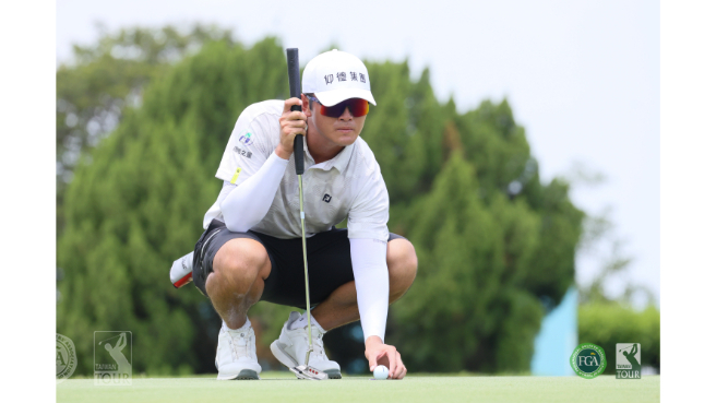 總獎金新台幣300萬元的肇喜登峰巡迴賽─頂粵吉品公開賽,今天在彰化台豐高爾夫俱樂部進行第二回合,謝霆葳推桿準,打出低於標準桿四桿的68桿丶日本選手梶村夕貴(