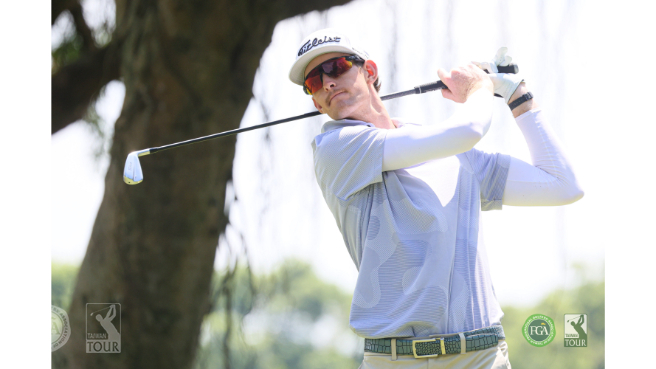 Leader Charles Porter struggled off the tee — just four fairways hit — and needed 30 putts. After birdies at the par-5 1st and 4th, he parred the final 14 holes without a bogey. His prodigious length reached the green at the 400-yard par-4 2nd in one, but a three-putt cost him a birdie. Sharp short-iron play repeatedly bailed him out from the rough. “The swing wasn’t stable today, so I focused on patience and saving par. I’m glad I kept it under par,” he said.